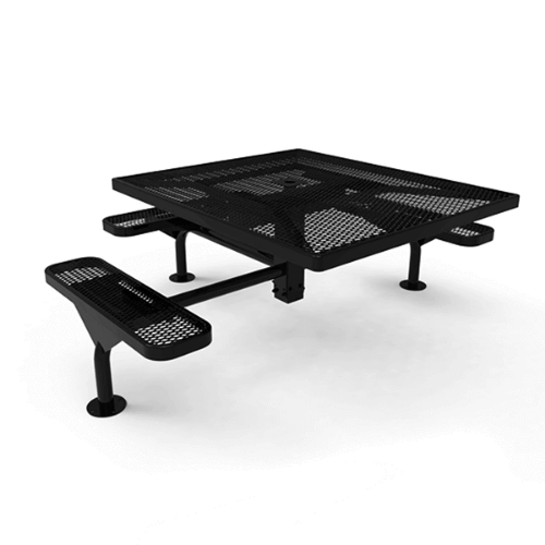 This Nexus Square Thermoplastic Steel Picnic Table boasts a commercial grade, 46" size and is coated with durable, Polyolefin RHINO construction. At 46" x 54", the table accommodates three seats in its ADA-compliant design, meaning all guests, including those in wheelchairs, can enjoy the table comfortably. Made from heavy-duty 3/4" #9-gauge expanded metal or 1/2" perforated hole-punched steel, the table stands strong on a 2-3/8" powder-coated steel frame and legs that can be surface or inground mounted. Plus, American-made construction and a 7-year warranty ensure long-term use in commercial settings.