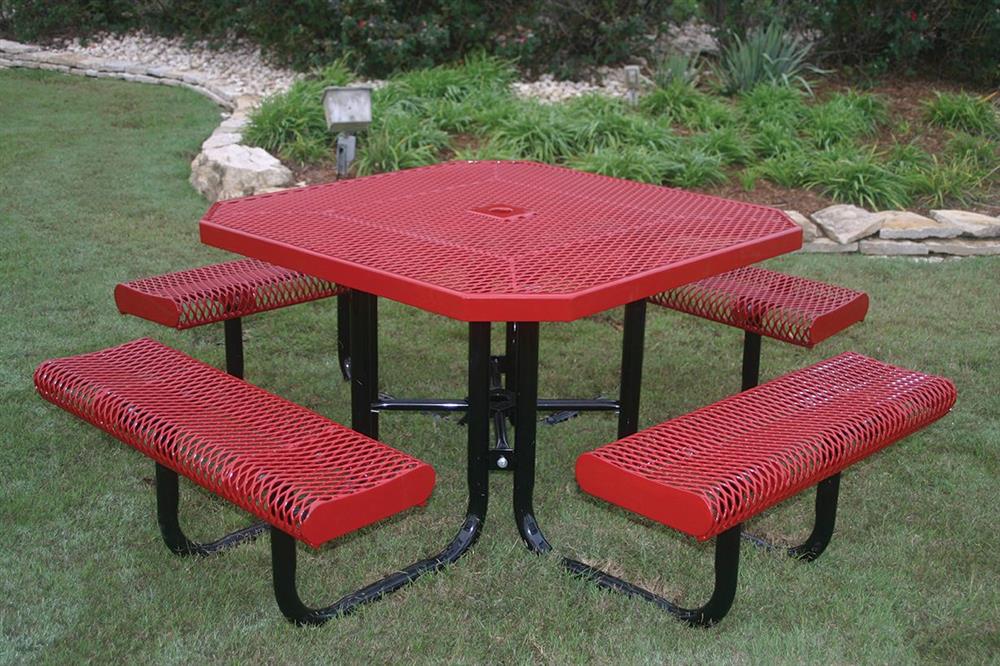 Other tables like the Square Thermoplastic Steel Picnic Table are coated with polyethylene thermoplastic that also protects from damaging weather effects such as rusting, chipping, and fading. This coating stands up to heavy wear and tear, making it an ideal picnic table for highly populated areas like parks and schools.