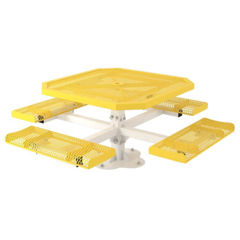 This picnic table features a 46" octagonal thermoplastic top with four seats that are attached to a 4" square pedestal post. The Rolled Regal Style features a plastic coated 3/4" expanded metal. This heavy duty picnic table is a great addition to outdoor eating areas, parks, and schools. This picnic table is popular due to the heavy duty frame and resistance to vandalism.Octagonal picnic tables are popular in schools and parks as it encourages interaction.