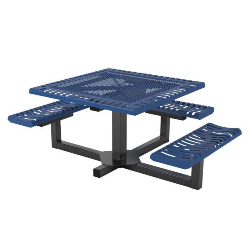 This picnic table has a square thermoplastic top and three attached benches. The Classic Style features a plastic-coated 3/4" expanded metal design inside an iron frame and seats of plastic coated ribbed steel with a galvanized steel powder-coated portable frame. The modern design is perfect for outdoor business meetings. The open side allows this table to be against a wall. Thermoplastic picnic tables are made to last for outdoor commercial use.