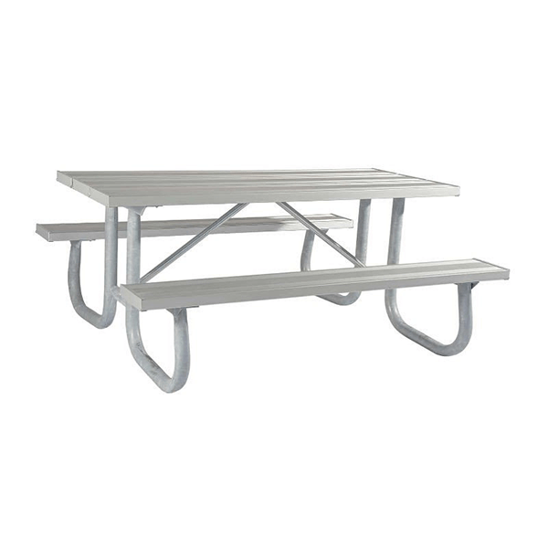 This 8 foot aluminum rectangular picnic table is made with light weight durable anodized aluminum planks. The "J2" series frame is made of heavy duty galvanized or powder coated 2 3/8" O.D. schedule 40 pipe. Center cleat holds top level and the 1 15/16" O.D. cross braces stabilize this heavy duty frame. This table will serve many years under heavy public use. Use this table at your campgrounds for group gatherings by the BBQ. Aluminum Picnic tables are popular in HOA communities because they are low maintenance and reliable.